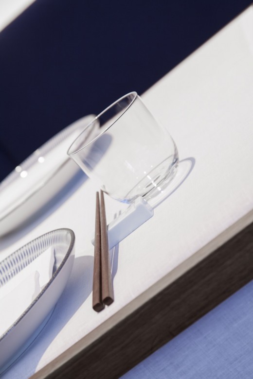 It took a mere fourteen weeks to transform the former Crone art gallery into a restaurant that reflects the chef’s culinary style: sophistication scaled down to the essentials. The restaurant is divided into a “white cube” on the ground floor with a “black box” below. In the white cube, oiled walnut tables stand on a polished mastic asphalt floor surrounded by differing tones of blue. Benches in Prussian blue frame the boundaries of the space. Down the stairs, the salon is furnished with brightly coloured carpets and oiled walnut lamellas. Here guests can have an aperitif in an intimate atmosphere “illuminated” by a sky of 500 light bulbs. On special request, guests are welcomed here in the show kitchen at the bar’s white Carrara marble counter to a private dining experience. The highlight of the restaurant is the “Krug table” with its hand made metal marqueterie. Made of the same oak typically used for champagne boxes, it is located directly next to the kitchen allowing guests a perfect view into the interior of Tim Raue’s sanctuary.